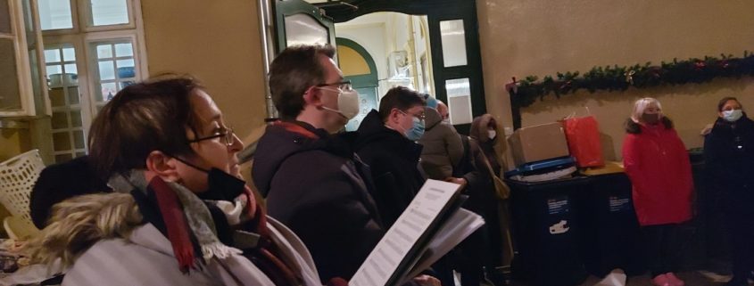 A Terézvárosi Adventista Gyülekezet énekkarának egy része és önkéntes szolgálattevők karácsonyi koncerttel és hasznos ajándékokkal látogatták meg a 6. kerületi hajléktalan családok átmeneti otthonának lakóit 2021. december 22-én.