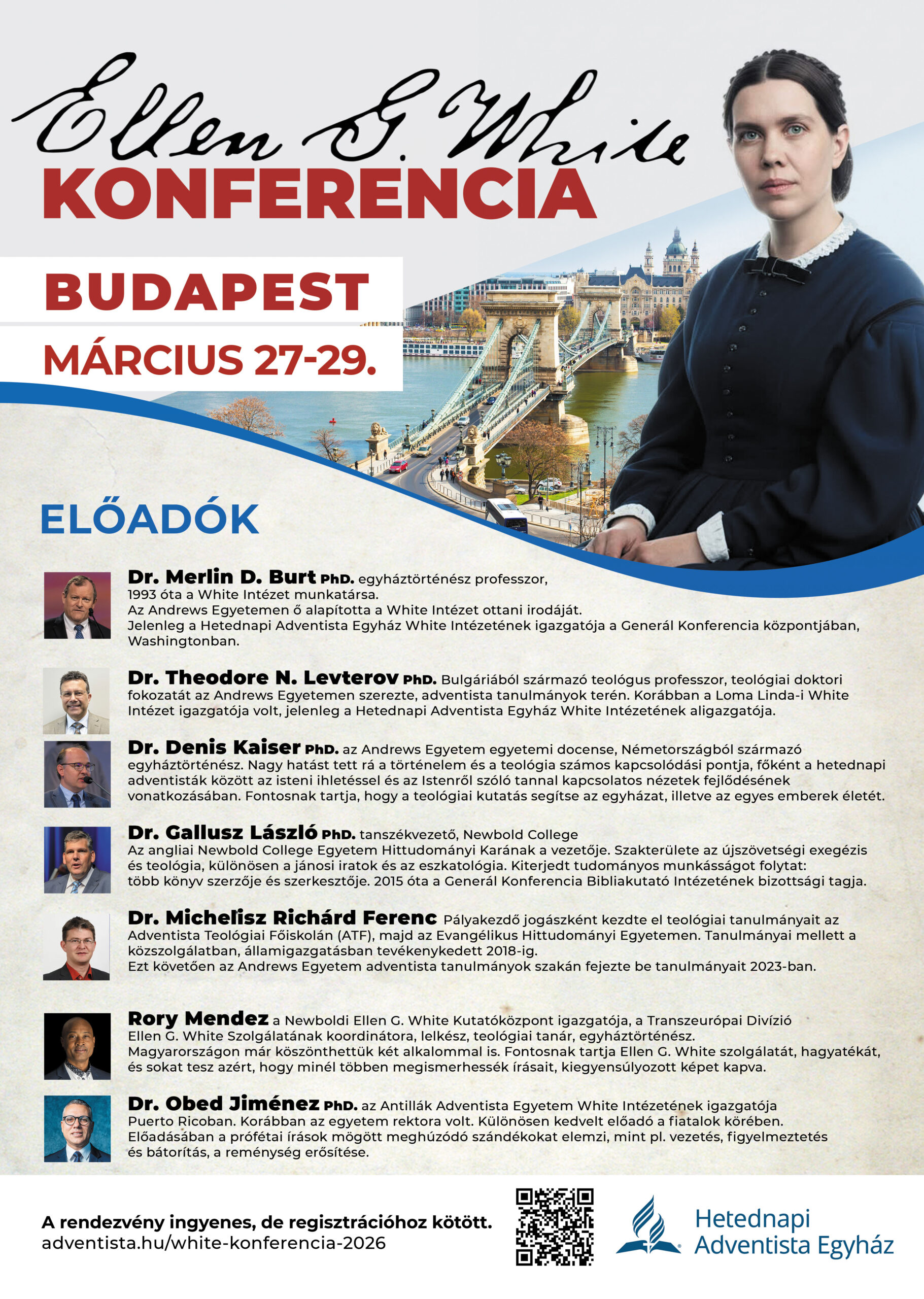 Amint már bizonyára értesültetek róla, a Magyar Unió az Adventista Teológiai Főiskolával és a Transzeurópai Divízióval közösen White Konferenciát szervez Budapesten 2026. március 27–29. között. A program 27-én, pénteken 17 órától vasárnap 12 óráig tart, és valóban különleges alkalomnak ígérkezik, mert egyszerre érkeznek előadók a White Intézet washingtoni központjából, az Andrews Egyetemről, valamint Angliából és még Puerto Ricóból is, akik Ellen White szolgálatának, hagyatékának mai szerepéről, értékéről tartanak előadásokat, emellett válaszolnak a résztvevők kérdéseire is.