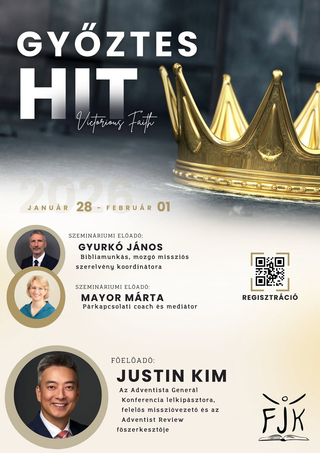 2026. január 28-tól február 1-ig újra megrendezésre kerül a Fiatalok Jézusért Konferencia, amely hétköznapokon a Terézvárosi Gyülekezetben, szombaton pedig az Europa Event Centerben várja az érdeklődőket. Az FJK mottója: Győztes hit, és a fő előadónk Justin Kim, az Adventist Review főszerkesztője.