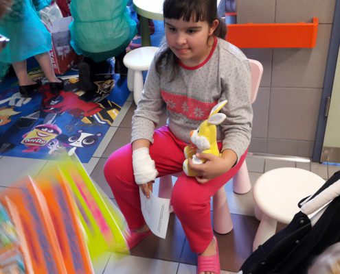 Még a 9 éves Tamarának is, aki szomorú arccal hallgatta a történetet, végül mosoly fakadt az arcán, amikor az ajándékkönyvet és a plüssjátékot a kezébe adtuk. Hát még akkor, amikor meglátta az édesapját! Nagy dolog, hogy ma már a szülők is ott lehetnek gyermekük betegágya mellett.