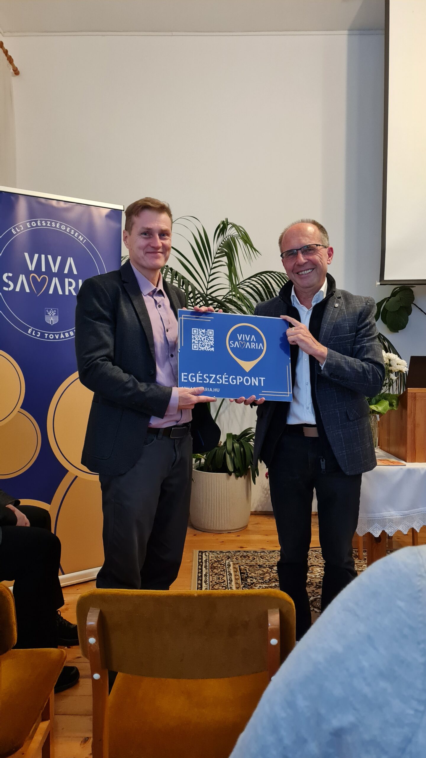 Ahhoz, hogy a mi gyülekezetünk is egészségpont lehessen, nagyban hozzájárult az új egészségbusz megjelenése, ami az egyik őszi napon, a polgármesteri hivatal előtt várta az érdeklődőket és a hivatal dolgozóit, akik meggyőződhettek arról, hogy nálunk a lelkesedéshez szakmai felkészültség is társul. És lelkesedésben sincs hiány: idősek, fiatalok, egész napjukat arra szánták, hogy mérjenek, tanácsokat adjanak, étellel kínálják az arra járókat. Volt köztünk orvos, természetgyógyász, egészségügyi végzettségű és saját gyógyulási tapasztalatáról beszámoló testvér. Az alpolgármester meg is jegyezte, hogy ritkán lát ilyen összehangolt önkéntes csapatot. Aztán 2025. október 11-én, Tóth Gábor élelmiszeripari mérnök előadása következett, amikor 94 vendég jelenlétében a városi egészségügyi koordinátor, Koczka Tibor ünnepélyes keretek között átadta a „Viva Savaria – egészségpont” táblát, amit kitettünk a gyülekezet falára.