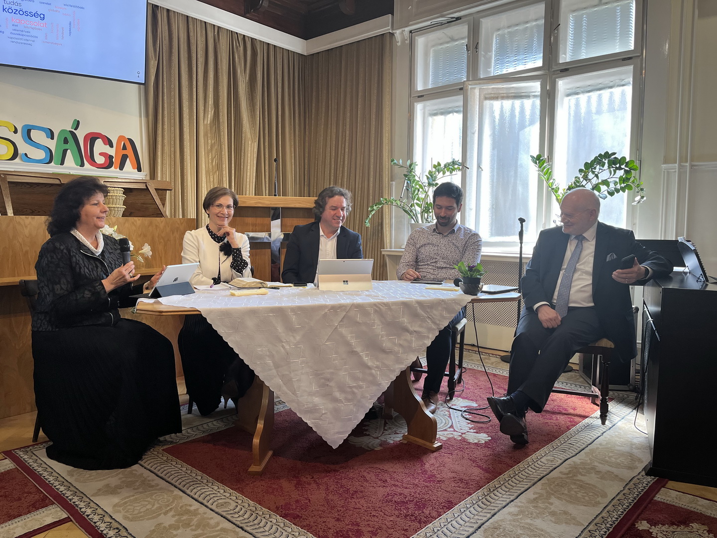 Igyekeztünk olyan módon megvalósítani a beszélgetést, hogy minél inkább aktivizáljuk, bevonjuk a jelenlévőket. Az alapot a panelbeszélgetés adta, ahol Zarka Kriszti és Péter, dr. Bondar Klári, Papp Arthur, valamint dr. Rajki Dávid mélyítettek ki egy-egy igeszakaszt, illetve témakört. Ezeket a gondolatokat bárki továbbfűzhette akár a helyéről, a kézi mikrofon segítségével, emellett pedig a kivetítőn folyamatosan megjelenő kérdésekre adott válaszokon keresztül. Ezeket a Mentimeter alkalmazásban tettük fel, a fiatalok a gyülekezet sorai között aktívan segítették a többieket, a folyamatot, és az anonim válaszokat a rendszer szófelhőbe vagy diagramokba összesítette. A kreativitást és lelkesedést nem nélkülöző szervezői csapat több hétközi egyeztetés során alkotta meg ezt a különleges, intergenerációs alkalmat, amihez a technikusok támogatása is nélkülözhetetlen volt.